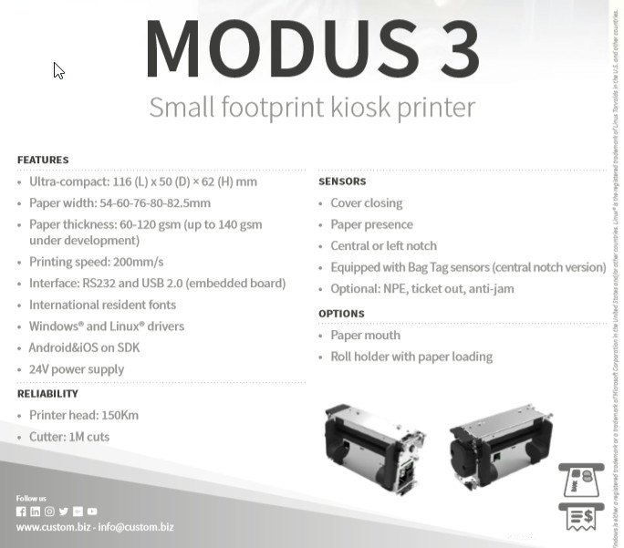 Printer Custom Modus 3. Kompakt kialakítású 3"-os, 200mm/s gyorsnyomtató. 60-120 GSM hőpa